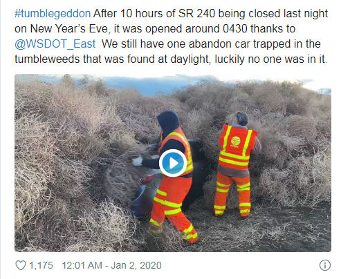 新年前夜美国华盛顿州过得可不是很和平。当地时间周二(2019年12月31日),该地遭受了暴风雨“突击”,更让人惊奇的是暴风雨竟裹挟着杂草呼啸而过,一时间在该州的一条高速公路上形成了一团长30英尺(约9米)的灌木丛。