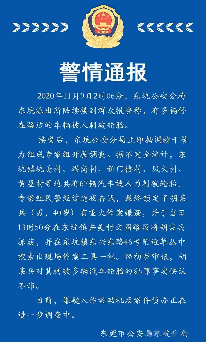 据不完全统计,东坑镇内共有67辆轿车被人为刺破轮胎。专案组民警于下午1点50分捕获胡某兵,并在东兴东路46号邻近草丛查找出作案工具一把。